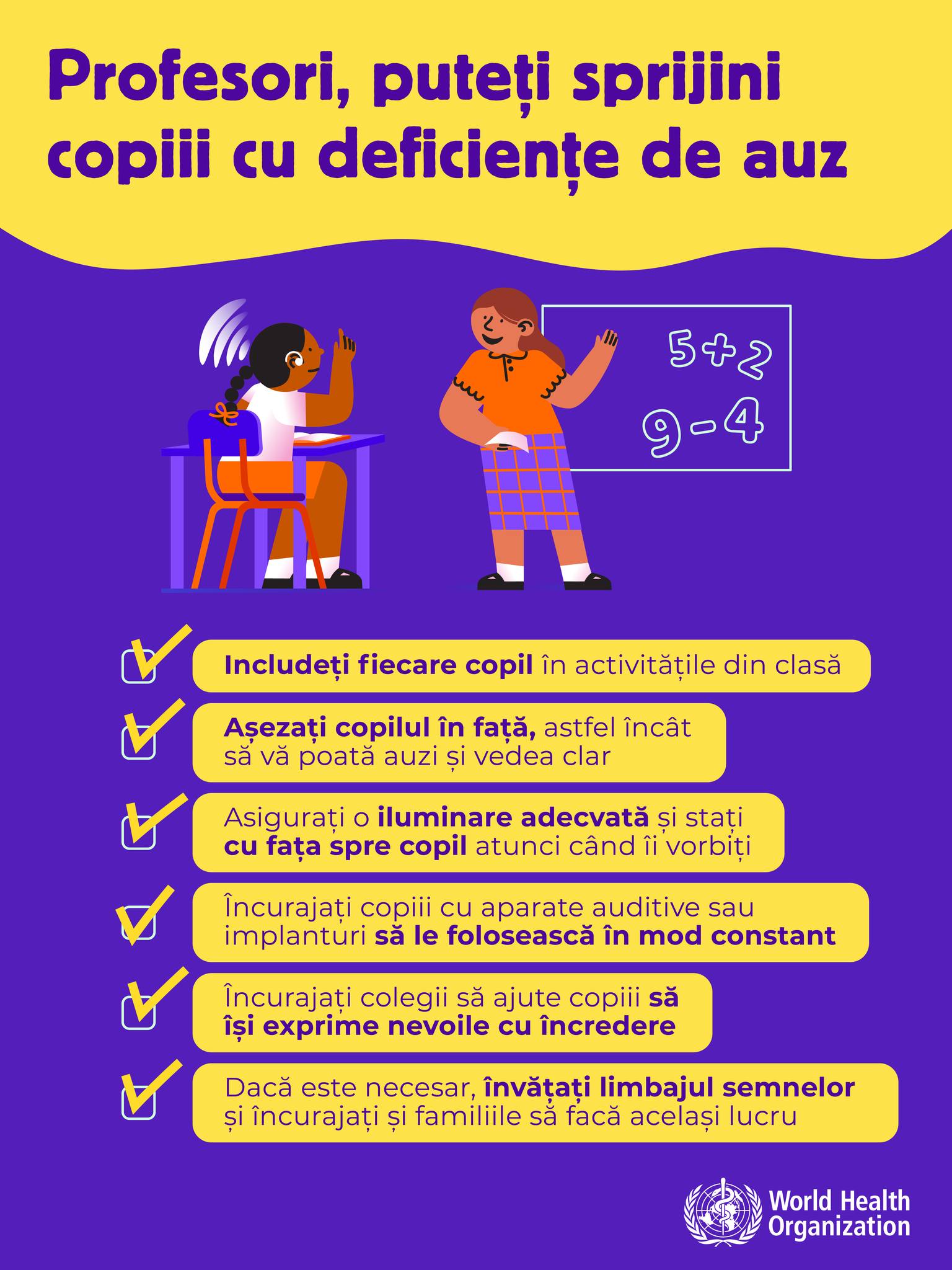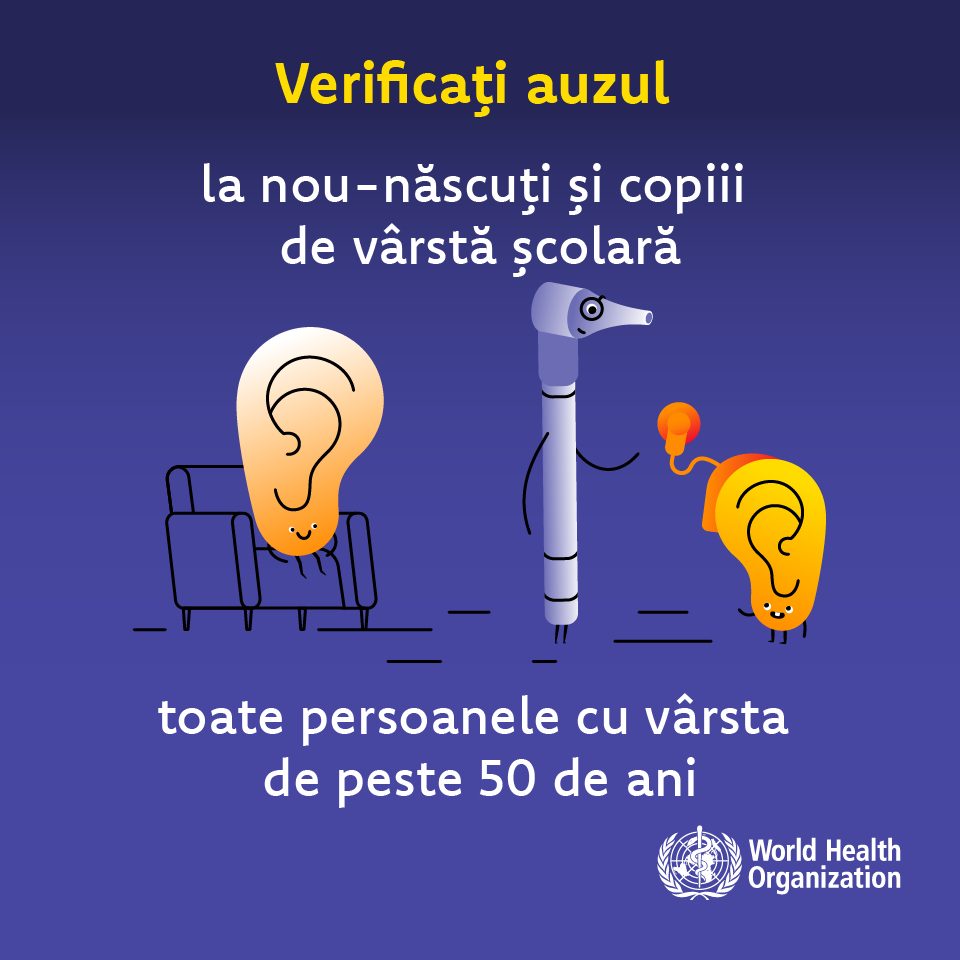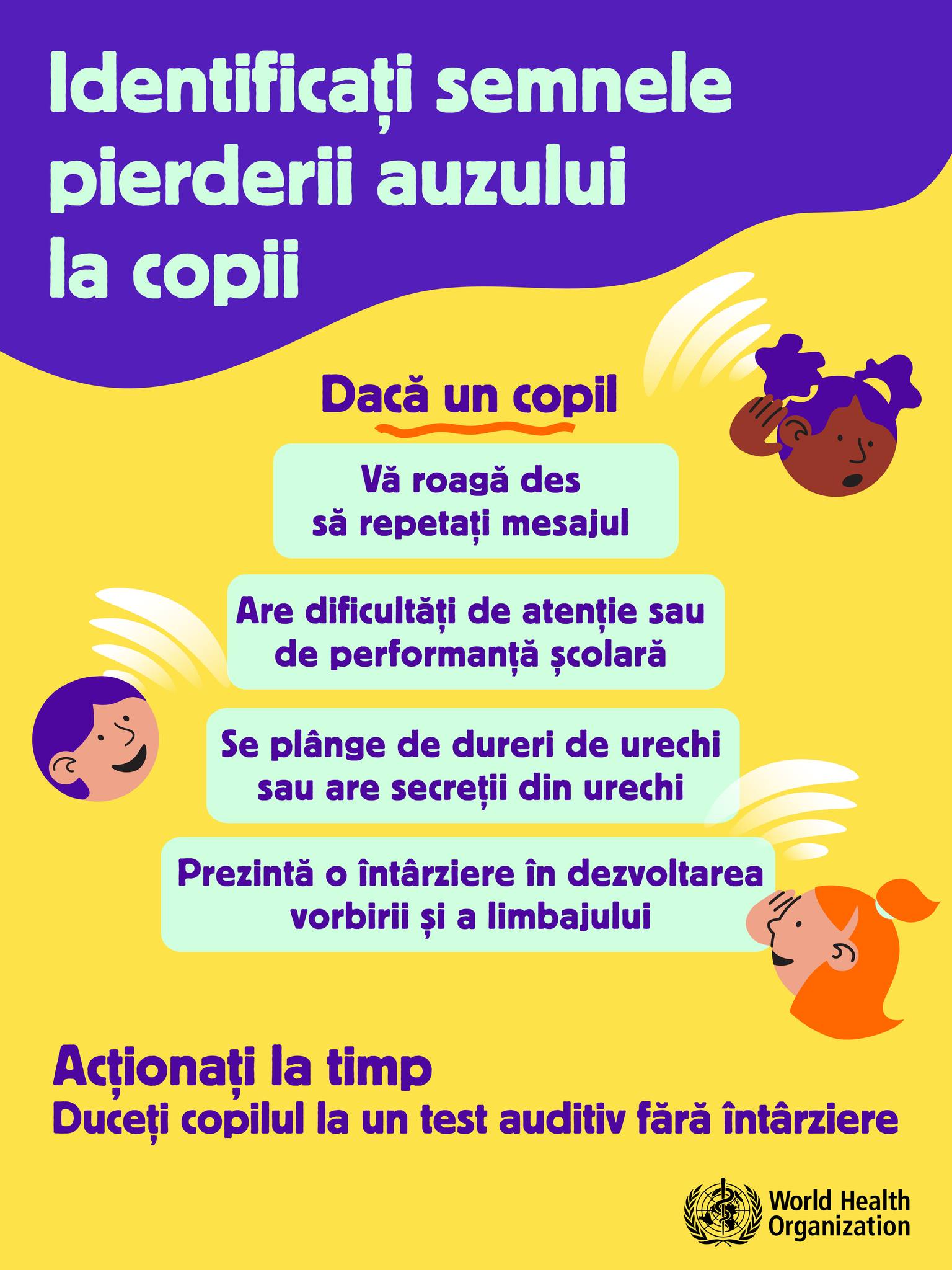 - Persoanele care trăiesc cu boli ale urechii sau pierderea auzului, identificarea și îngrijirea timpurie sunt cruciale pentru a preveni impactul pe termen lung asupra dezvoltării, educației și oportunităților viitoare.