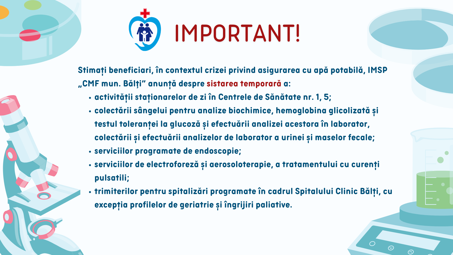 În acest context, IMSP „CMF mun. Bălți”, precizează că va continua să își desfășoare activitatea în strictă conformitate cu prevederile și restricțiile acestora precum și a Ordinului IMSP „CMF mun. Bălți” nr. 53 din 16.03.2026 „Cu privire la asigurarea activității în cadrul IMSP „CMF mun. Bălți” în legătură cu criza privind asigurarea cu apă potabilă”, care prevede sistarea temporară a: